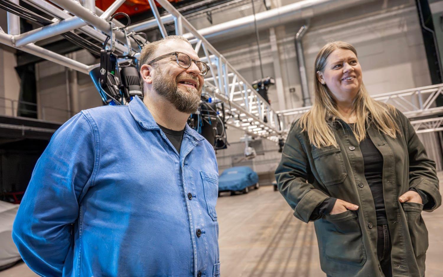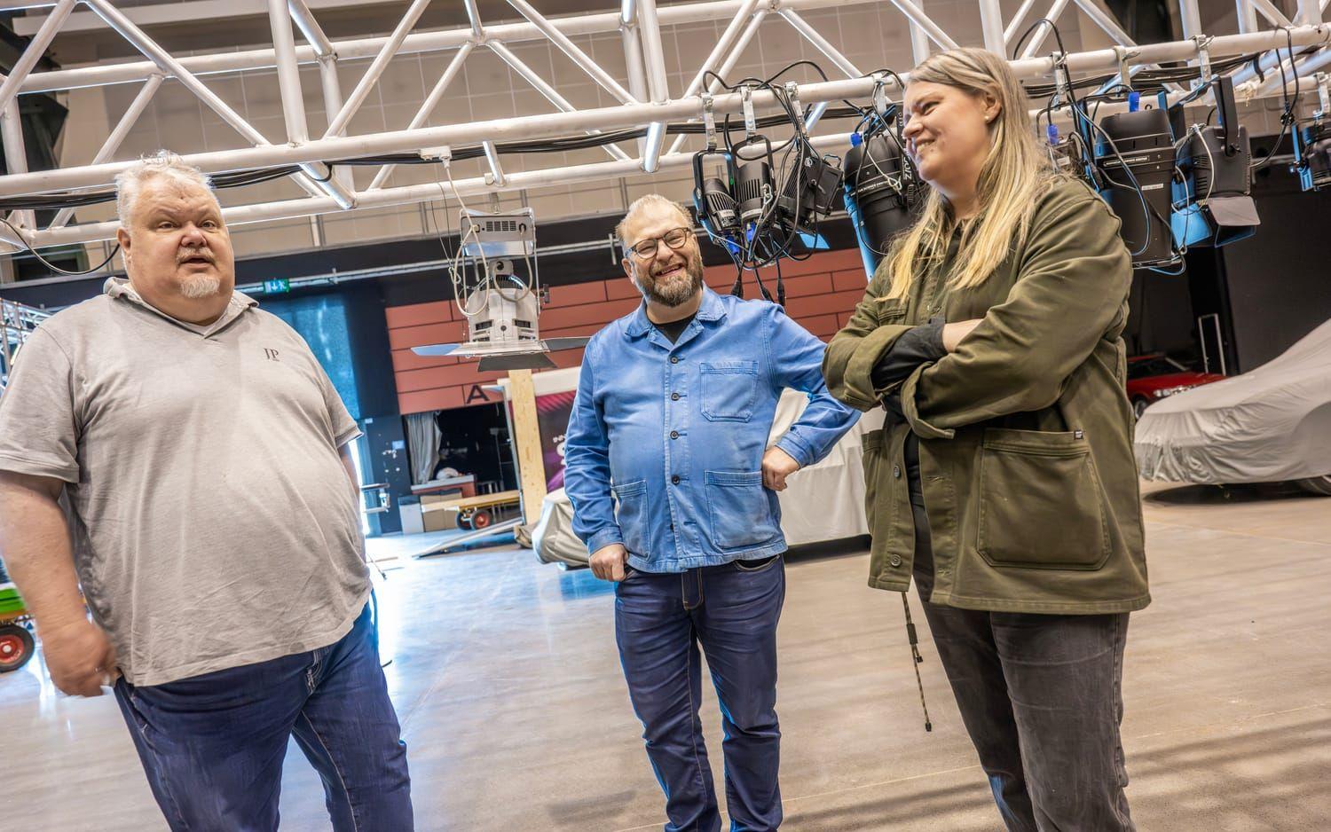 Förklaringen är Nova Arena, som är en stor box som nu håller på att fyllas med bilar. Allt är noga planerat. Ljusrampen som sitter i taket har hissats ned och spotlights håller på att monteras så att varje Saab ska synas ordentligt.