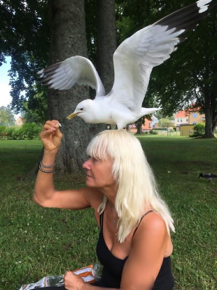 På en bild från onsdagen ser man hur måsen sitter på Annas huvud och gapar efter mat.