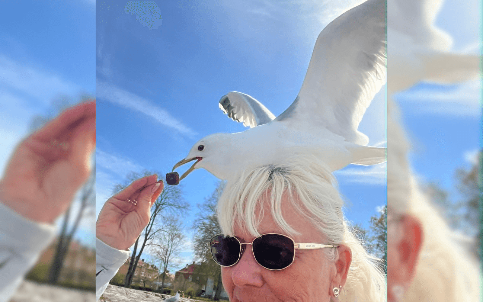 Bland de skrikande fiskmåsarna som kämpade för maten hon delade ut valde en mås att hoppa upp och sätta sig – på hennes huvud.