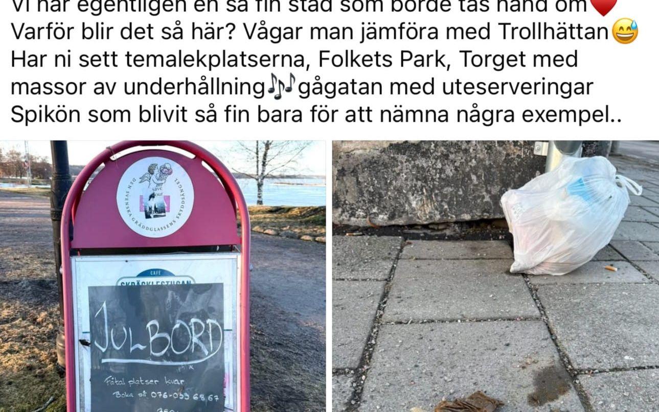 I sitt inlägg tar hon även upp Folkets hus som gått i konkurs, Folkets park som vittrar sönder och en scen på gågatan som står tyst. Hon jämför med Trollhättans temalekplatser, Folkets park, torget, Spikön och gågatan med alla uteserveringar.